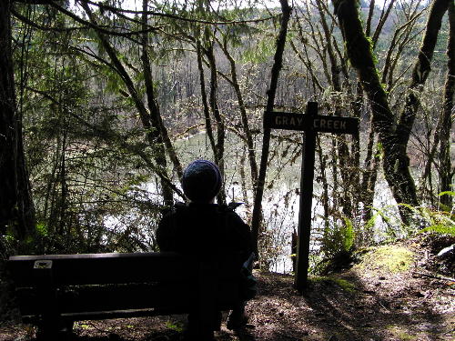 This 3-mile trail has many nice benches to stop and rest or just enjoy the view. One of the most interesting views is from this bench above Gray Creek looking out on a vast beaver pond. For directions to help you find the Refuge, click on map. |