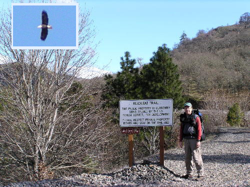 Jim on the Klickitat Trail - insert - Bald Eagle The Klickitat Trail is located on an abandoned railroad bed, so at first seemed a little boring, but we were soon caught up in the beauty of the river and the bird life. A covey of Quail scuttled out of site, Scrub Jays were busy in the oaks, Robins searched the greening grass and Northern Flickers let out their tell tale call. Then we spotted Bald Eagles soaring above the canyon, a total of five riding the thermals. We almost stepped on some tiny Gold Stars, our first of the season.