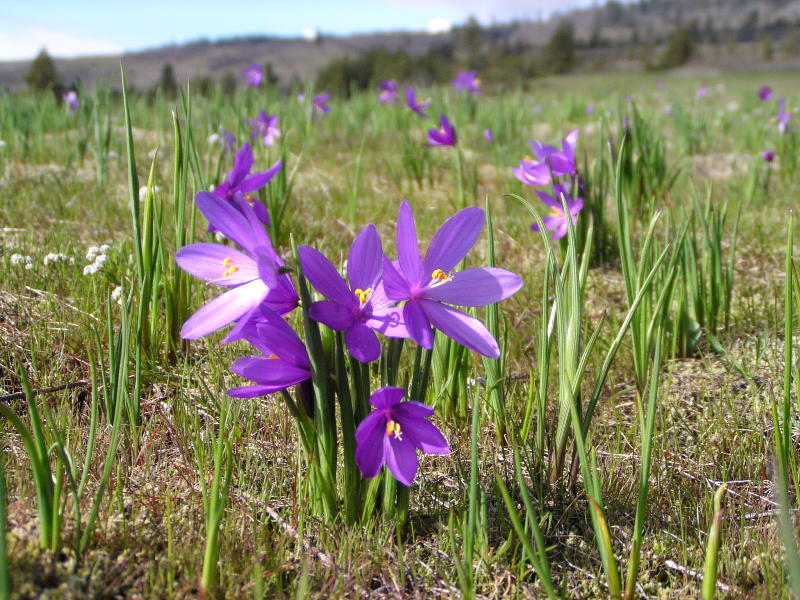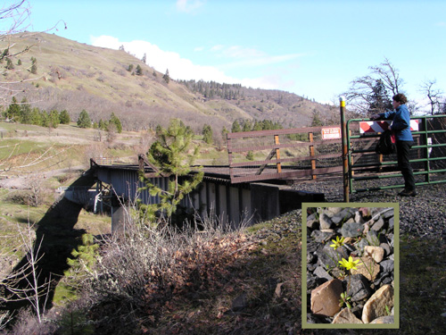 Jeanette at Fisher Hill Bridge - insert - Gold Stars After returning to the trailhead in Lyle, we drove to Rowland Lake to enjoy our lunch and then rambled around Catherine Creek area for a while, totally mesmerized by the carpet of Grass Widows, whose delicate satin blossoms shimmered in the sunshine.